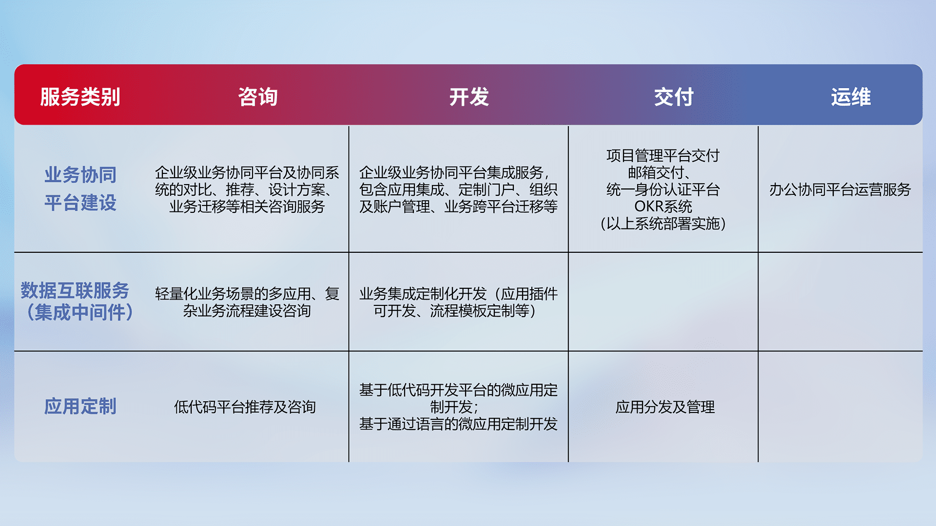 针对钉钉、、、、企微、、IDaas等平台级产品提供产品的规划、、方案、、、、交付、、定制化开发等服务,,实现如统一协同办公、、、智能客户服务、、、混合会议管理、、智能数据查询、、等业务场景,,,,实现数字化转型。。。