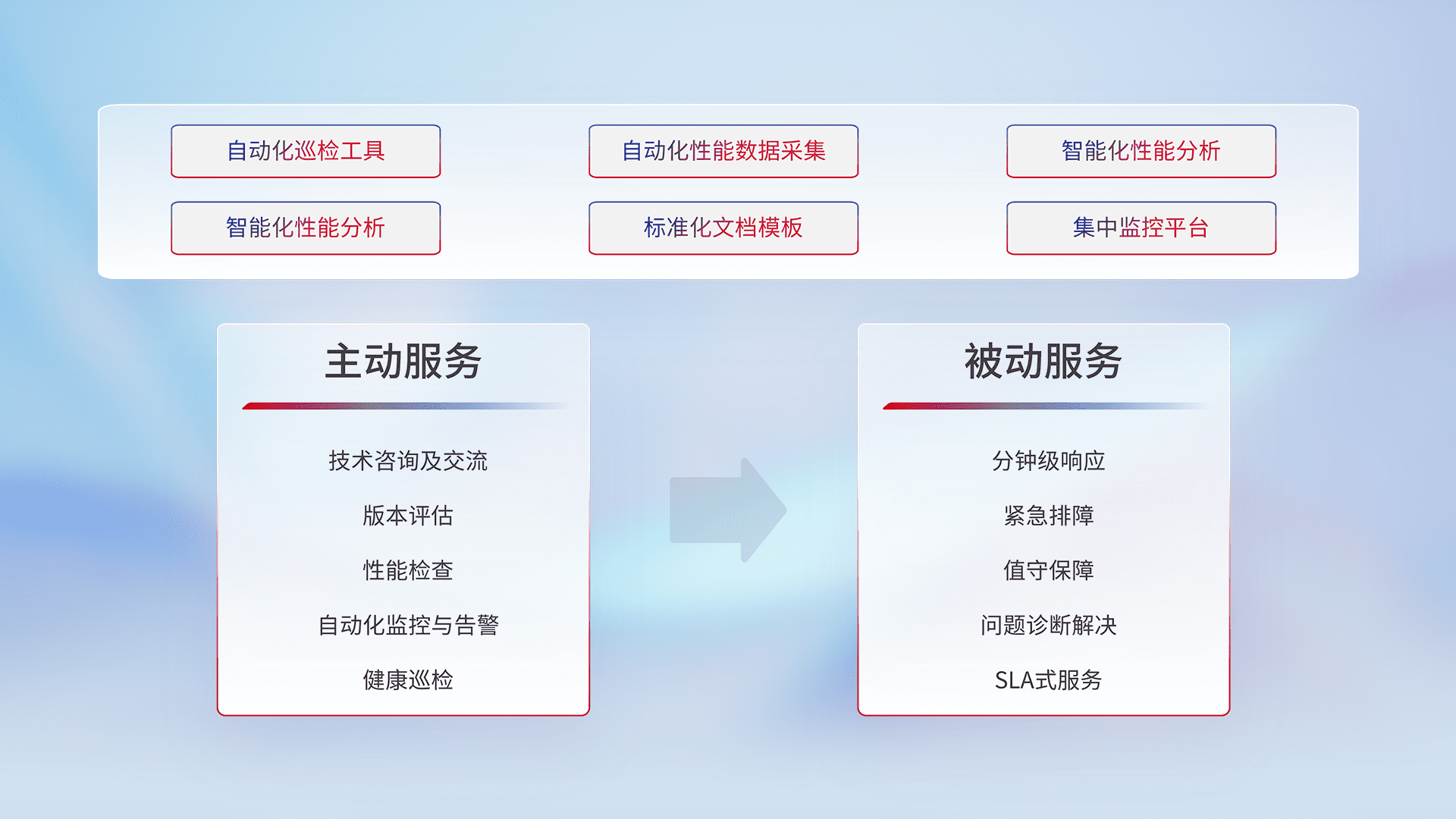 智能化工具和标准化文档,,,保障服务质量,,,提供主动服务(包含技术咨询、、版本评估、、、、性能检查、、、、自动化监控与告警、、健康巡检)和被动服务包含(分钟级响应、、、、紧急排障、、值守保障、、问题诊断解决、、SLA服务)。。。